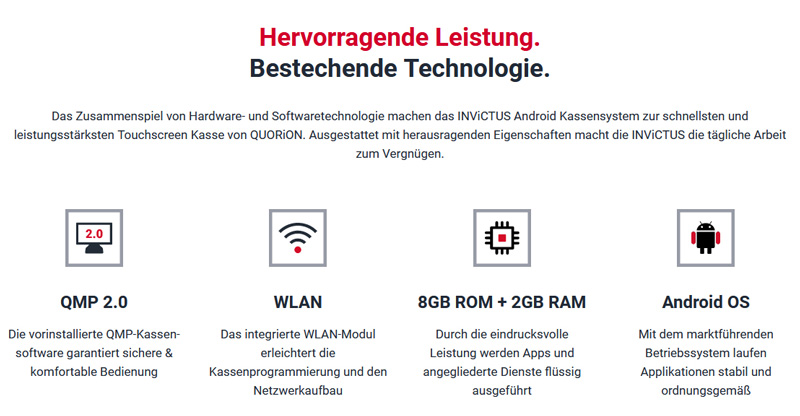 Die INViCTUS bietet die vertrauten Funktionen sowie Bedienphilosophien von QUORiONs QTouch-Kassengeneration mit neuester Hardwareausstattung im puristischen Designkonzept.