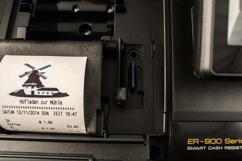 Zur Programmierung, Datensicherung und Erfüllung der gesetzlichen Auflagen ist die ER-900er Serie mit einem SD-Kartenslot ausgestattet, der so entwickelt und positioniert ist, dass er vor unberechtigtem Zugriff geschützt ist.